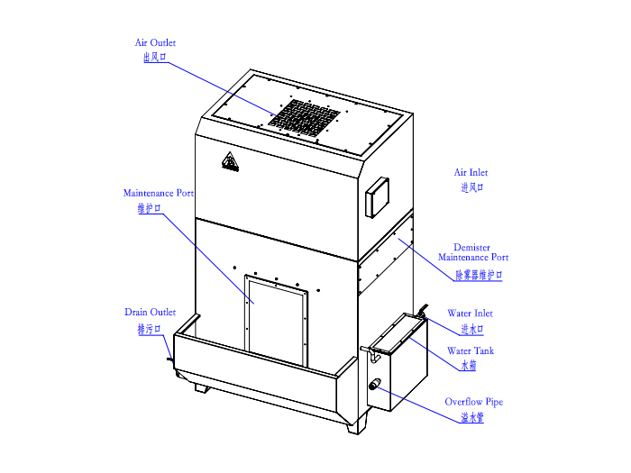Dưới áp suất tiêu cực do quạt tạo ra, khí chứa bụi vào mô-đun lọc nước và tiếp xúc chặt chẽ với chất lỏng (thường là nước). Thông qua tác động quái lực giữa các giọt nước và các hạt bụi và các cơ chế thu thập khác, thiết bị có hiệu quả nắm bắt các hạt lỏng hoặc rắn có đường kính trong3-30 μmphạm vi và cũng loại bỏ một số chất ô nhiễm khí. Nước được kéo lên bởi dòng chảy khí; kết hợp với bộ phận tiêu chỉnh và tiêu chỉnh, sự tách khí-chất lỏng xảy ra và chất lỏng trở lại bể, đạt đượctái tuần hoàn nước không cần bơm . Hệ thống đạt được hiệu quả thanh lọc của ≥90% cho các hạt lớn hơn 10 μm.